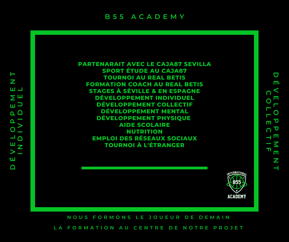 🏀 Formule Basket-Études : 2.350 €/an (soit 235 €/mois sur 10 mois), comprenant tous les services et tenues de la B55 Academy.
