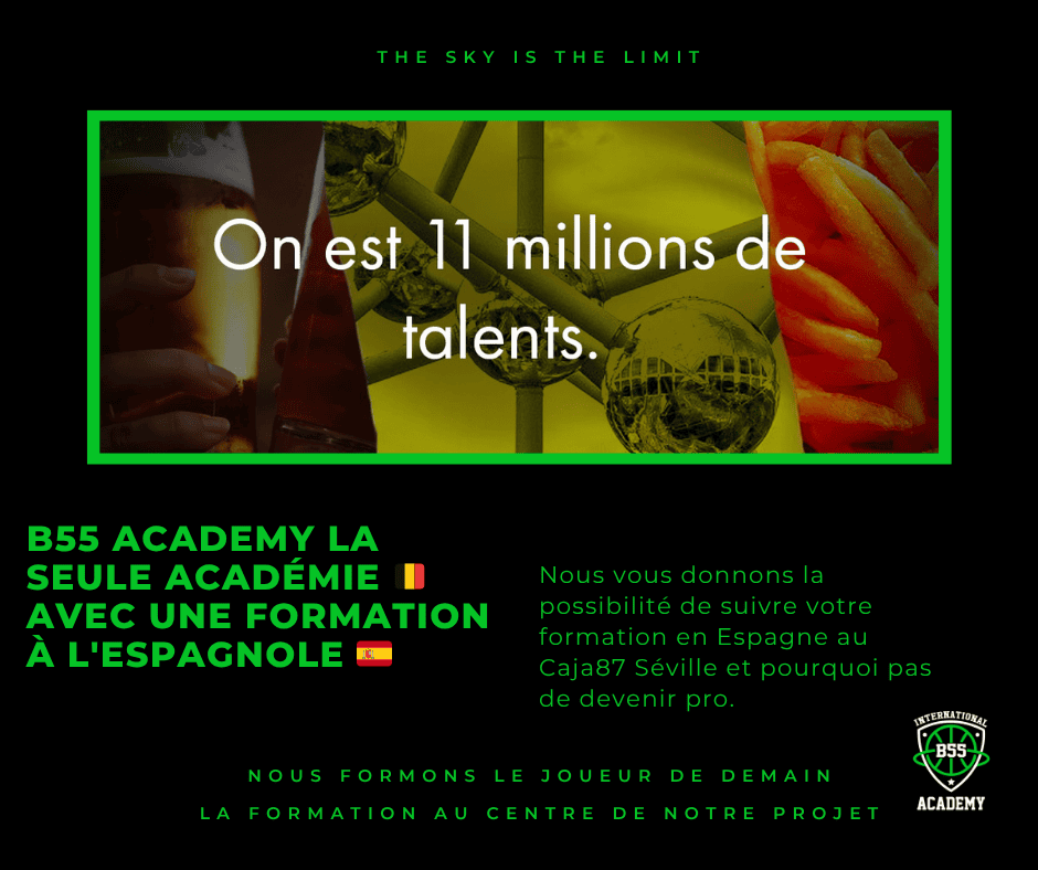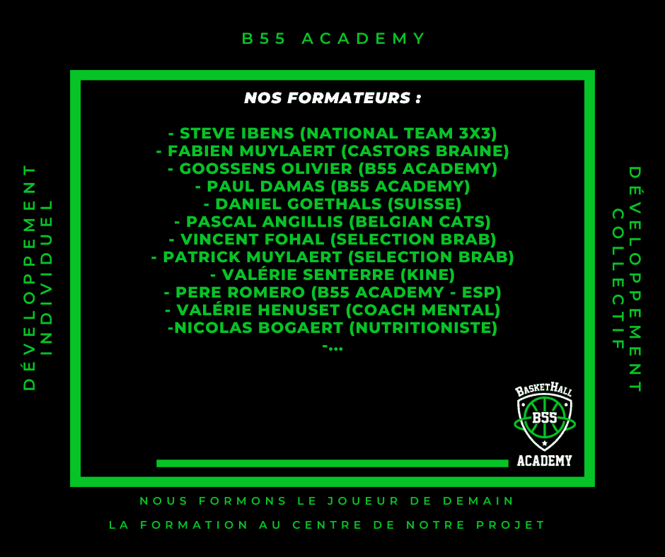 Notre formule propose que nos jeunes puissent s’entrainer tout les jours après les cours de 15h30 à 18h00 au Baskethall55 et le mercredi PM. Pour les jeunes qui décident faire partie de notre club de la B55 Academy, il y aura 3 entrainements collectif en plus par semaine. Et pour les filles nous avons un partenariat avec le club de Castors Braine.